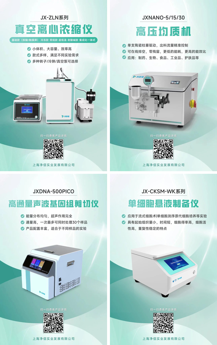 十幾年來凈信不斷進行自我創(chuàng)新與突破。通過持續(xù)優(yōu)化產(chǎn)品性能和提升服務(wù)質(zhì)量,我們實現(xiàn)了從單一產(chǎn)品到多元化發(fā)展的轉(zhuǎn)變,拓展了市場影響力。上海凈信科研者系列產(chǎn)品也在上市推廣中!真空離心濃縮儀、高壓均質(zhì)機、單細胞懸液儀、高通量聲波基因組剪切儀。