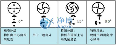 三次元旋振篩,由直立式電機作激振源,電機上端安裝偏心重錘(基準塊),下端安裝可調(diào)節(jié)偏心塊,如下圖所示,當兩側(cè)偏心塊向中間合攏,振幅變小;當偏心塊向兩側(cè)分離,振幅變大。通過調(diào)節(jié)偏心塊的位置將電機的旋轉(zhuǎn)運動轉(zhuǎn)變?yōu)樗健⒋怪薄A斜的三次元運動,通過調(diào)整下端兩偏心塊的夾角大小來控制振幅,把這個運動傳遞給篩面調(diào)節(jié)下端偏心塊的相位角,可以改變物料在篩面上的運動軌跡。